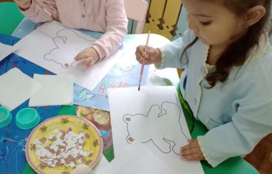 Для воспитанников второй младшей группы «Солнышко» было проведено занятие по аппликации в нетрадиционной технике (обрывная аппликация) «Мишка косолапый»